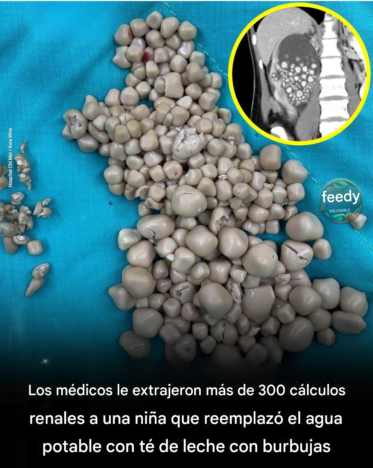 Según The Independent del 16 de diciembre, el equipo de urología del Hospital Chi Mei de Tainan, Taiwán, se sorprendió al encontrar más de 300 cálculos renales en una joven de 20 años llamada Xiao Yu. Le realizaron una cirugía para extirpar la enorme cantidad de cálculos.