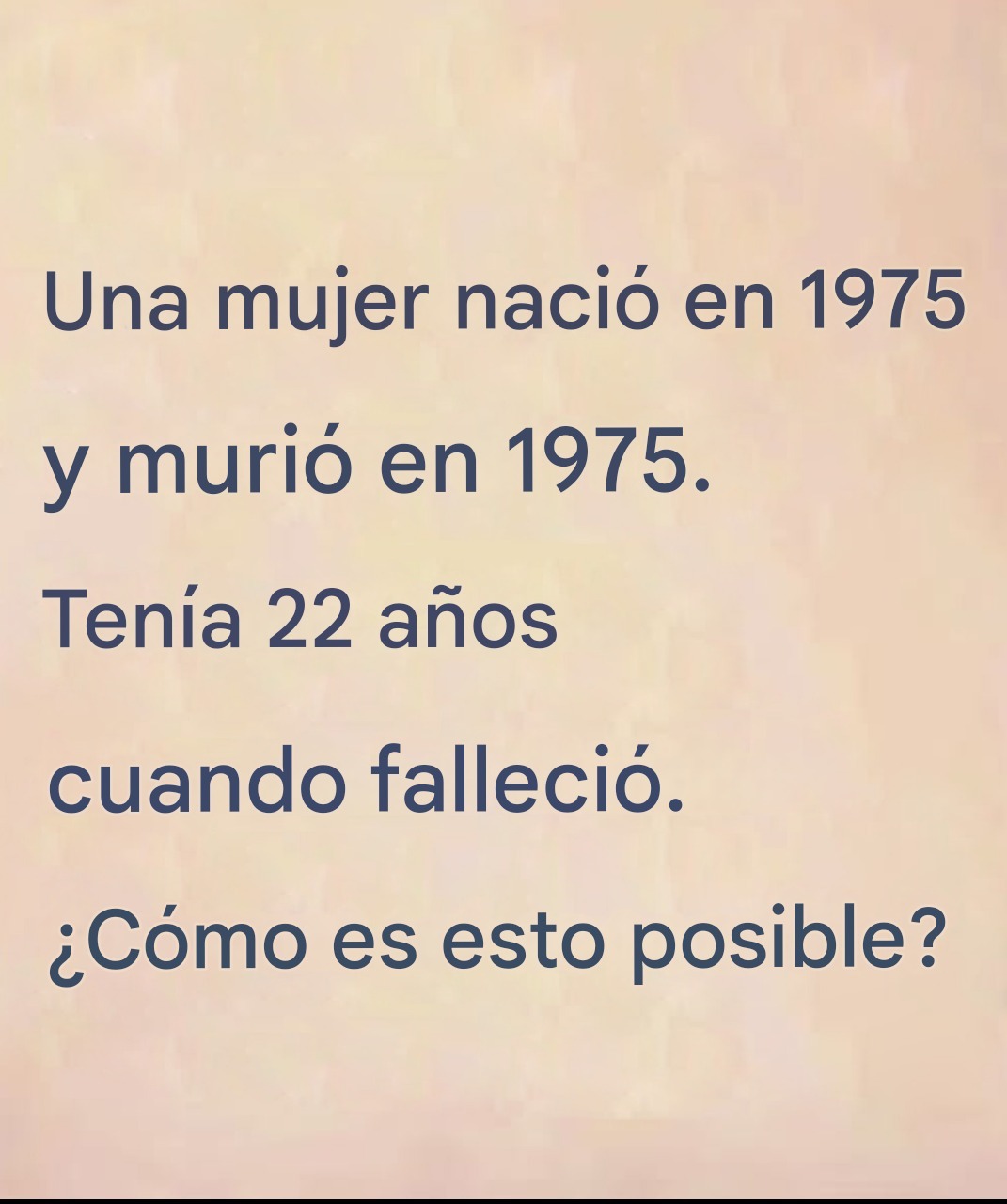 Imagina esto: te topas con esta extraña frase mientras revisas tu sección de noticias: «Una mujer nació en 1975 y murió en 1975. Tenía 22 años». Te deja paralizado. ¿Incomprensible? ¿Desconcertante? Seguro que hay algo más… ¿Pero dónde está la trampa? Agárrate fuerte, porque este enigma desafía nuestra lógica, nuestras respuestas automáticas y requiere un … Read more