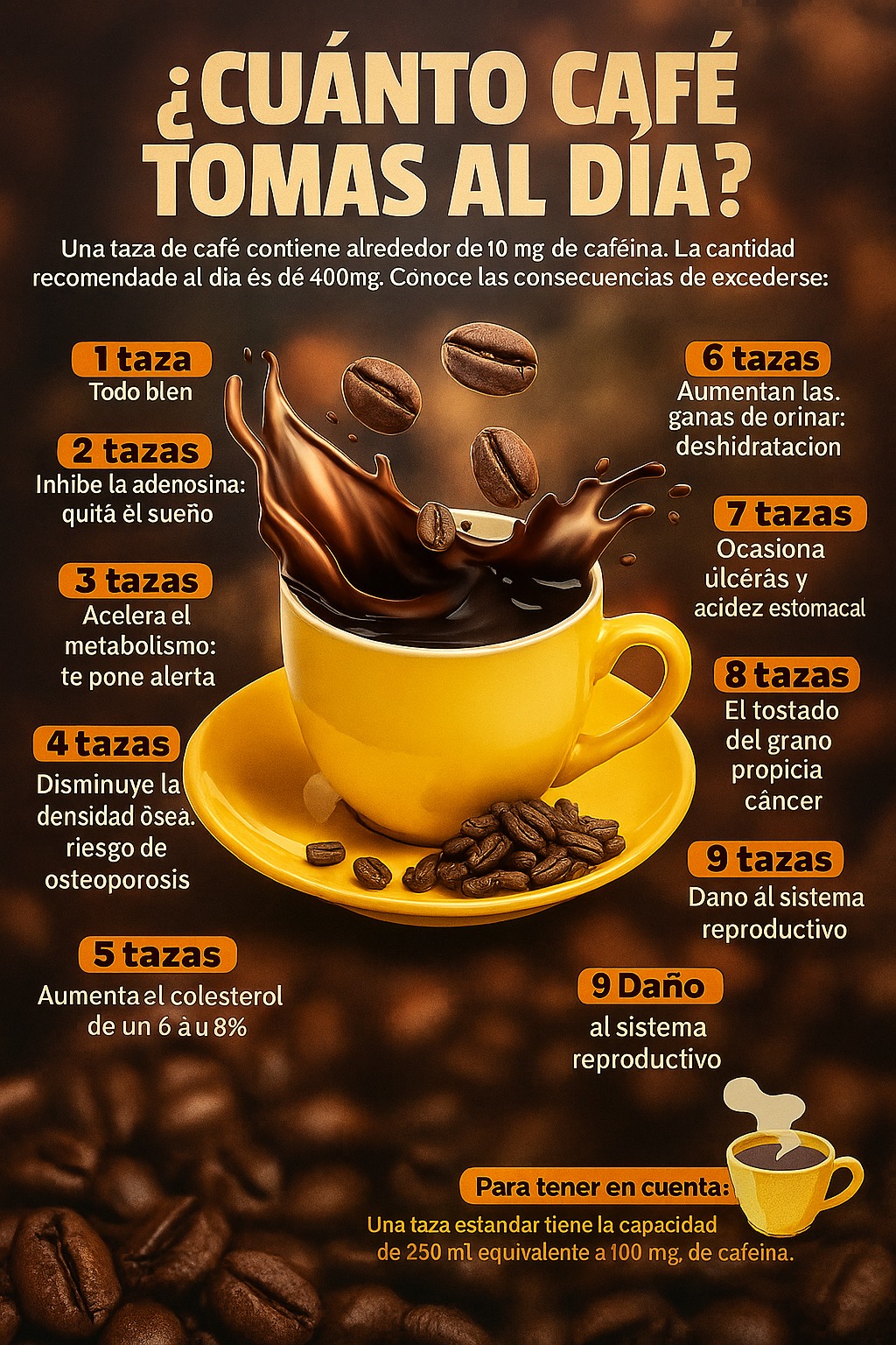 El café es una de las bebidas más consumidas en el mundo, pero excederse puede traer consecuencias. Una taza estándar de café (250 ml) contiene aproximadamente 100 mg de cafeína, y la cantidad máxima recomendada es de 400 mg al día (equivalente a 4 tazas).