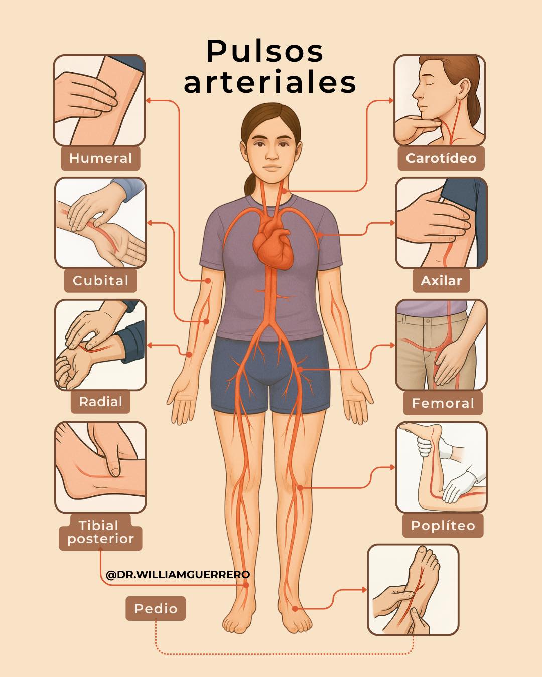 En la imagen puedes ver los principales sitios donde se palpan los pulsos: